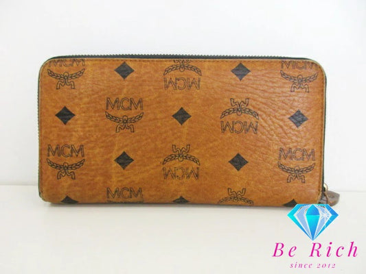 MCM エムシーエム 二つ折り財布 ラウンドファスナー 長財布 スタッズ ヴィセトス モノグラム ロゴ コニャック キャメル レザー ロング ウォレット 【中古】【送料無料】 bs3621