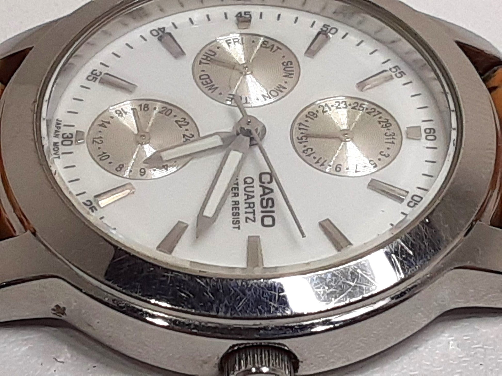 カシオ CASIO メンズ 腕時計 デイデイト トリプル カレンダー MTP-1192 白 茶 ホワイト ブラウン SS レザー ブレス アナログ クォーツ QZ ウォッチ 【中古】【送料無料】 ht5338