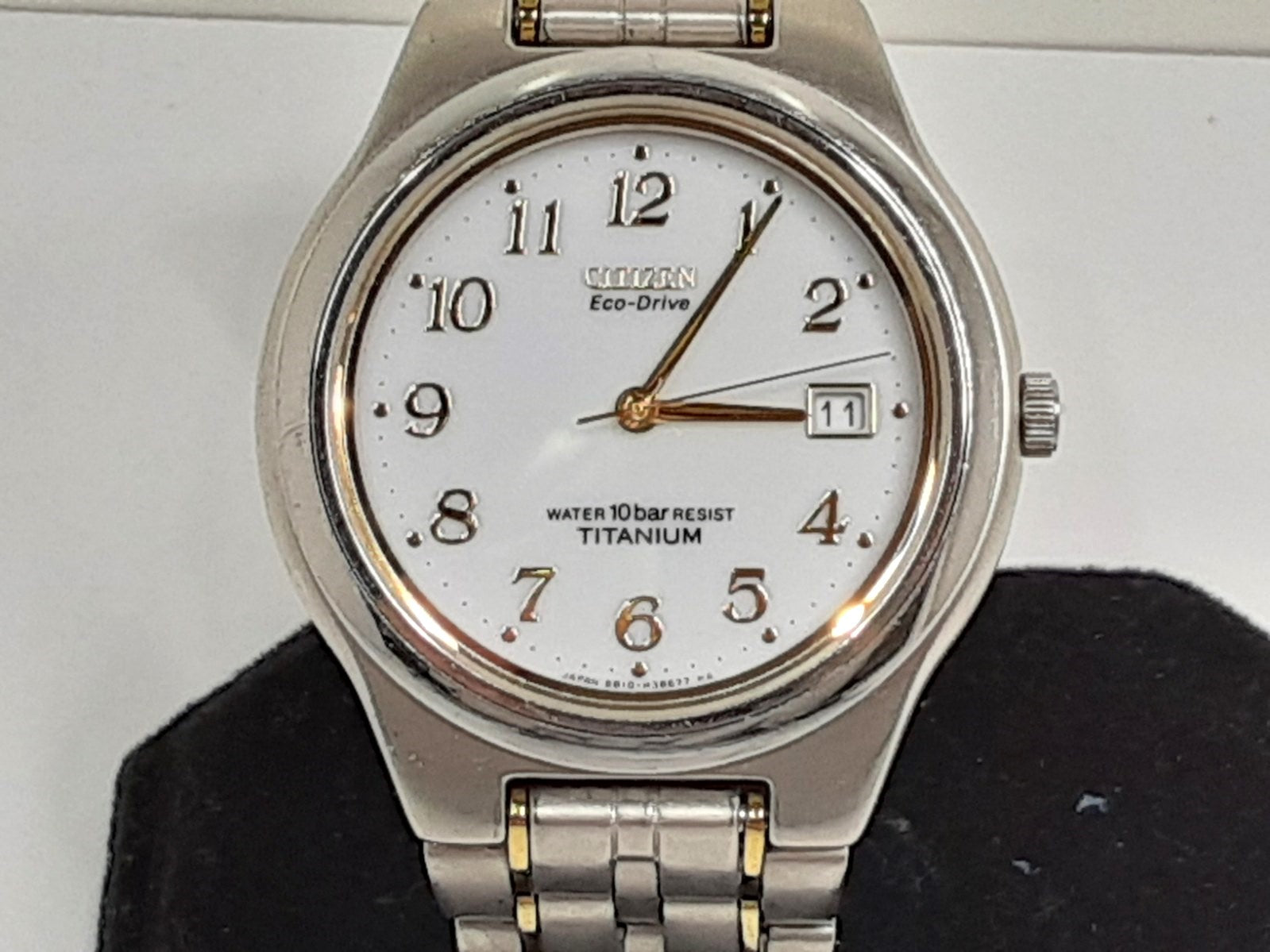 シチズン CITIZEN エコ ドライブ メンズ 腕時計 デイト B810-H22757 白 ホワイト シルバー ゴールド チタニウム チタン アナログ ソーラー クォーツ QZ ウォッチ 【中古】【送料無料】 ht5362