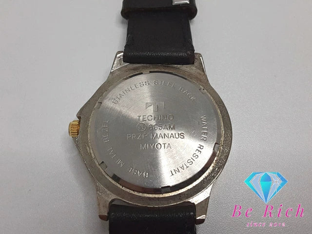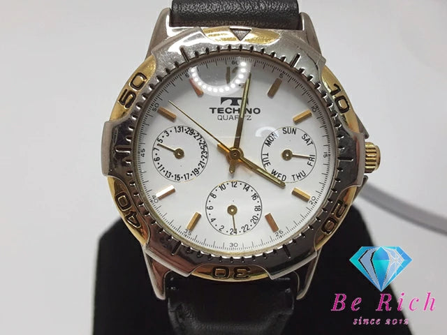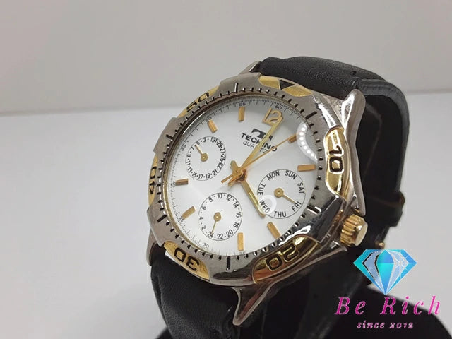 TECHINO メンズ 腕時計 白 ホワイト 黒 ブラック SS レザー ブレス アナログ クォーツ QZ ウォッチ 【中古】【送料無料】 ht4767